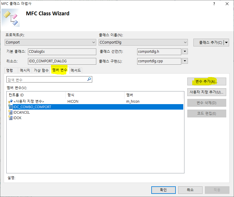 COMBOBOX와 매칭되는 멤버 변수를 만들도록 하겠습니다.