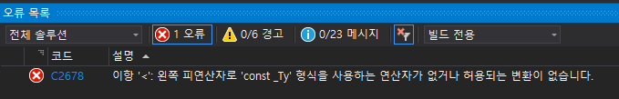 c2678 이항'<':왼쪽 피연산자로 'const_Ty' 형식을 사용하는 연산자가 없거나 허용되는 변환이 없습니다. 본문